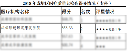 2018年医疗质量大检查,我院从成华区38家参检医疗机构中脱颖而出,以总分563.33的高分被评为四星,成为免检1年的8家医疗机构之一。